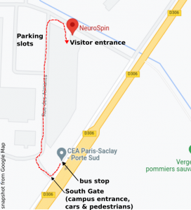 Once at the bus stop CEA-Porte Sud – Mare du Vivier, Neurospin is just in front of the bus stop, however you need to walk around the building to access the main entrance (see map on the current page).
